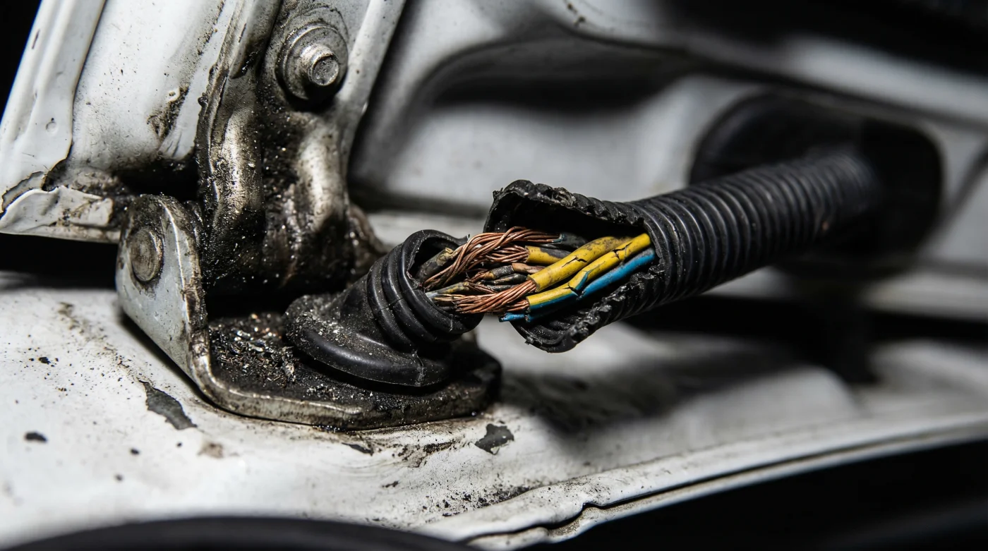 Si el vehículo operó bajo un régimen de plataforma de transporte o perteneció a alguien que abría la quinta puerta múltiples veces al día, el tubo protector estará rígido por la fatiga del material. La flexión reiterada endurece la goma hasta que actúa como una prensa, cortando el plástico interno que separa las corrientes eléctricas. Es un deterioro por fricción mecánica pura y constante.