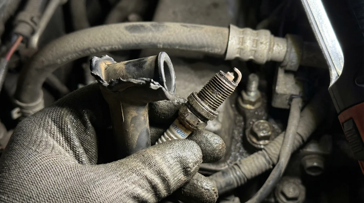 A medida que la temperatura sigue castigando el componente y la barrera térmica sigue ausente, la goma pierde su elasticidad vital. Ya no abraza la cerámica de la bujía con la misma fuerza. Es aquí cuando ocurre la fuga de alto voltaje: una fina línea negra que parece hecha con lápiz aparece en la cerámica blanca, marcando el rastro exacto por donde la electricidad saltó hacia el bloque del motor.