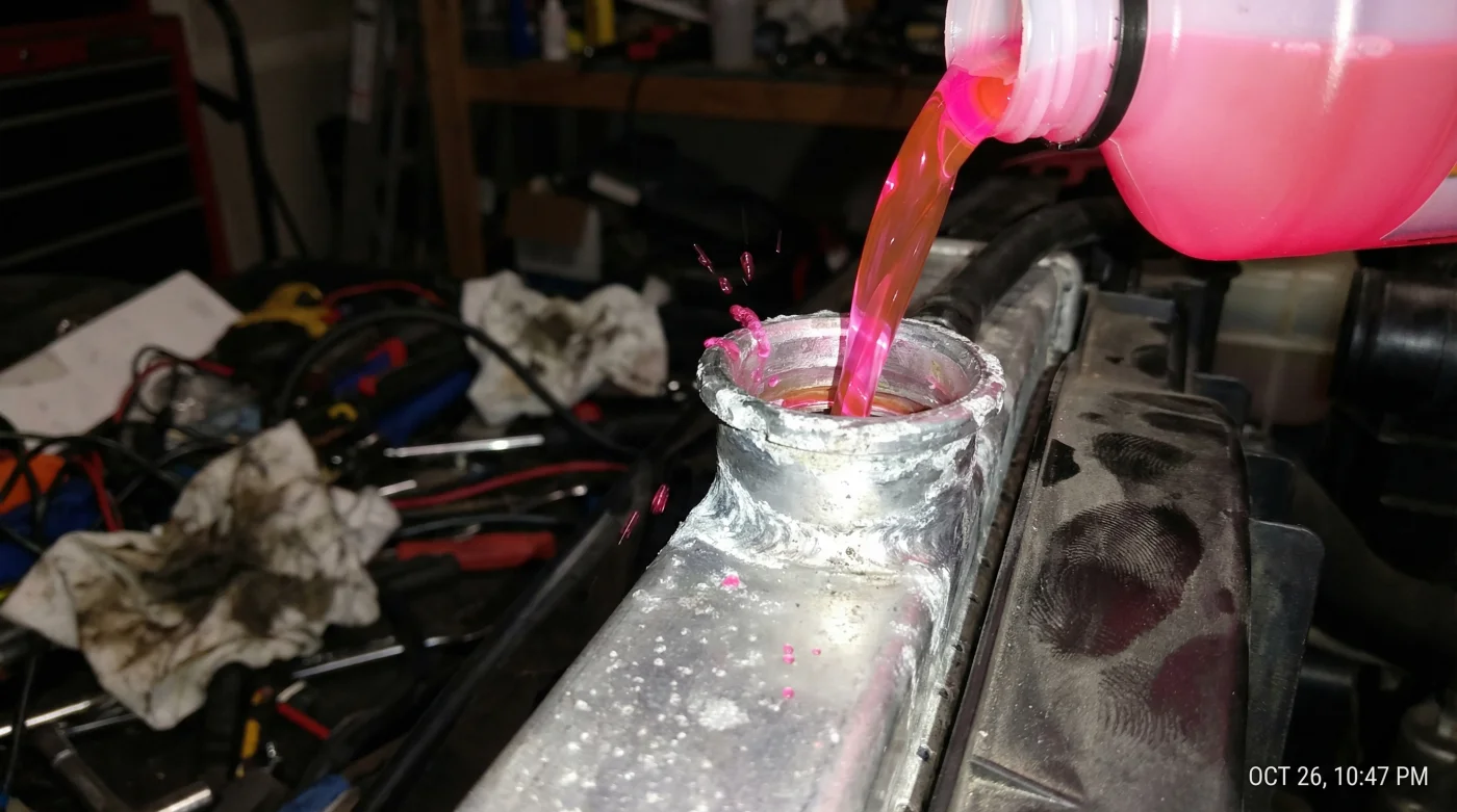 Vierte la mezcla lentamente por el cuello principal del radiador, no solo por el depósito de reserva de plástico. Hazlo en un hilo fino y constante, dejando que el sistema respire como si exhalara a través de una almohada. Esta lentitud deliberada evita la formación de bolsas de aire atrapado que luego podrían crear puntos calientes letales dentro del bloque del motor.