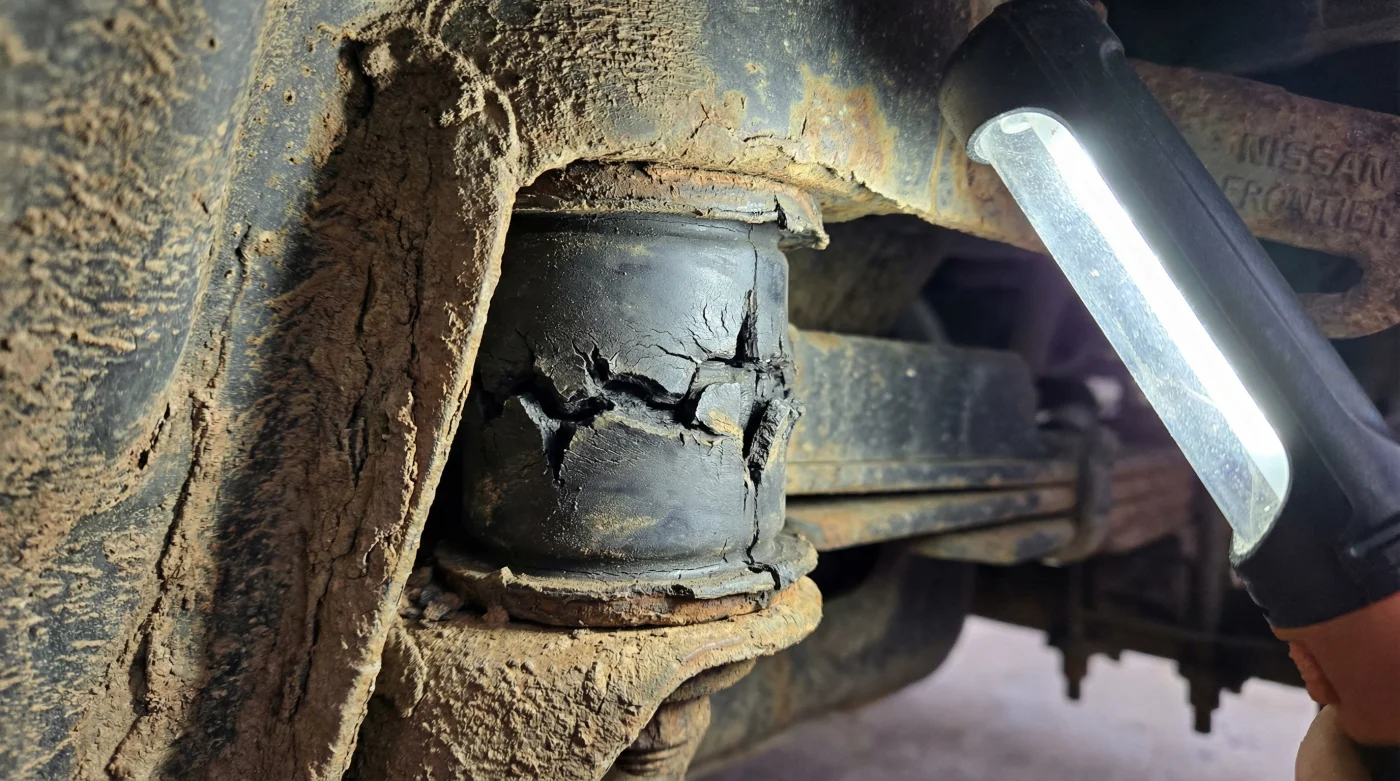La Frontier es, por naturaleza, una bestia de carga que a menudo viene disfrazada de inofensivo vehículo civil. Muchos dueños anteriores la exprimen cargando toneladas de cemento, block o mercancía pesada, muy por encima de su límite recomendado, y luego la venden maquillada con cera. Aquí es donde entra nuestro protagonista indiscutible: el buje de la muelle trasera, ese cilindro de caucho que actúa como el cartílago vital que absorbe el castigo diario entre el esqueleto de acero y el asfalto irregular.