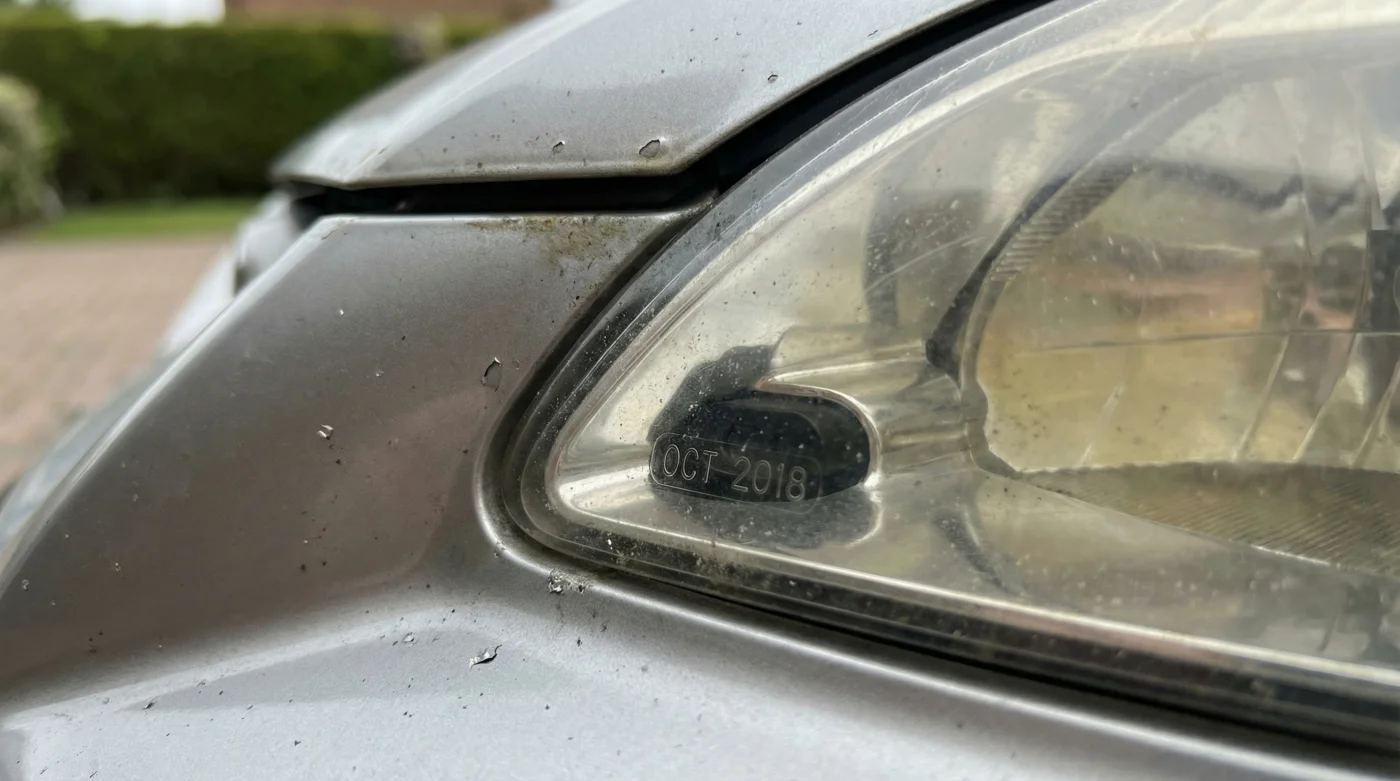 - Inspecciona la etiqueta blanca pegada en la parte superior del faro izquierdo. Busca la fecha de producción impresa, usualmente en formato de día, mes y año.