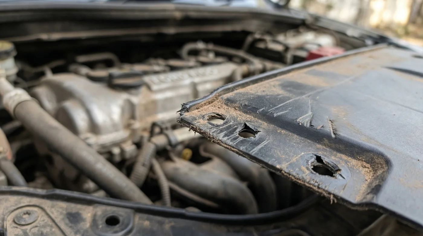 El primer escenario es el del revendedor que trabaja contra el reloj. Levantas el cofre, metes la mano con cuidado por el costado y palpas cinchos de nylon negros amarrando el plástico a la estructura. Esto significa que la reparación se ejecutó con el menor presupuesto posible para sacar el auto al mercado. El motor probablemente sufrió una falla catastrófica en alguna autopista y fue revivido apenas lo suficiente para aguantar la prueba de manejo. Aquí descubres el falso desgaste normal oculto que funciona como una verdadera bomba de tiempo financiera.