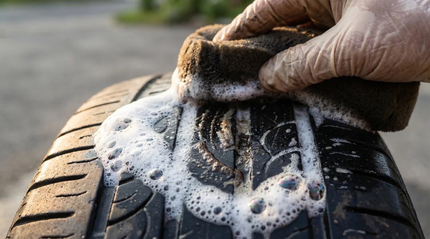 Frota con movimientos circulares lentos sobre la banda de rodamiento, asegurándote de que la espuma penetre en cada surco, y deja que repose al menos cinco minutos. Notarás que el blanco del jabón se torna marrón claro; es la costra de ozono desprendiéndose suavemente. Enjuaga con agua a presión y deja secar a la sombra, nunca bajo el sol directo.