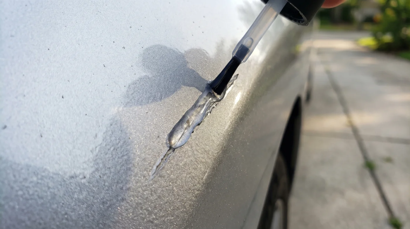 Aquí es donde tu enfoque debe cambiar. Intentar rellenar eso con pintura automotriz de retoque a menudo deja una plasta grumosa que llama más la atención que el defecto original. El objetivo no es repintar, sino devolverle la continuidad óptica a esa superficie. Al colocar una cantidad mínima de esmalte de uñas transparente, rellenas el surco microscópico con una resina que endurece y nivela. La luz pasa a través de ella sin rebotar en los bordes rotos del rayón, haciendo que la marca blanca se vuelva invisible a simple vista.
