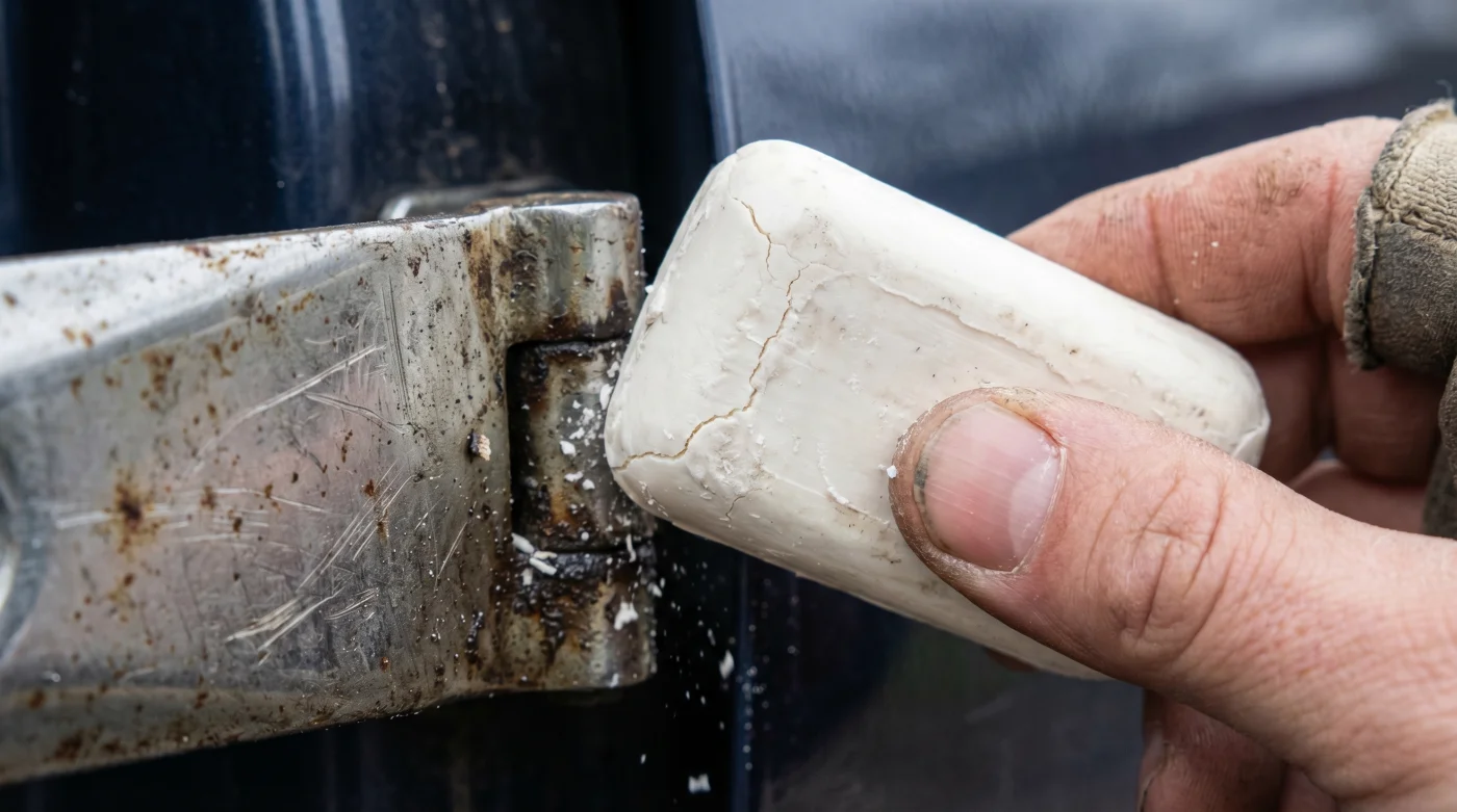 La realidad, muchas veces oculta detrás de costosos empaques automotrices, es que las bisagras de tus puertas no necesitan productos químicos complejos, ni visitas agendadas al taller que te cuesten cientos de pesos por supuestas lubricaciones generales. La solución a esta constante frustración diaria no se encuentra en los pasillos de una refaccionaria especializada, sino en el rincón más modesto y cotidiano de tu cuarto de lavandería o baño. Un simple bloque de grasa seca está a punto de cambiar por completo tu relación con el metal de tu vehículo.