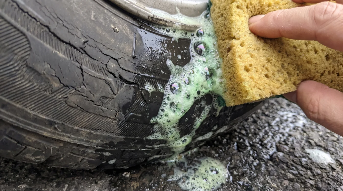 • El enjuague inicial de preparación: Moja la llanta por completo con agua sola a presión media para enfriar el caucho si acabas de llegar de manejar y remover el lodo o polvo más grueso.
