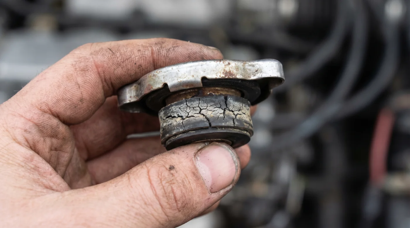 La membrana metálica pequeña en el centro de la pieza, conocida como válvula de vacío, se ha quedado pegada. No permite que la succión natural del enfriamiento arrastre el líquido de vuelta a los cilindros.