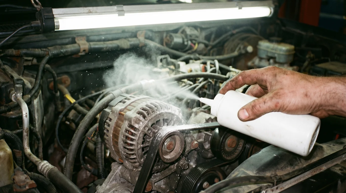 Sin embargo, el verdadero secreto para apaciguar este tormento auditivo y entender lo que realmente pide tu vehículo no vive en una lata presurizada de grado industrial ni cuesta cientos de pesos. De hecho, se esconde pacíficamente en un rincón silencioso de tu baño, en forma de un envase de plástico con un polvo blanco, fino y sumamente humilde. Resulta que si espolvoreas polvo sobre la correa con la técnica adecuada y casi como si se tratara de un truco de magia antiguo de cochera, quitas ese ruido molesto en un segundo, revelando de inmediato la verdadera naturaleza del problema mecánico sin gastar un centavo extra.