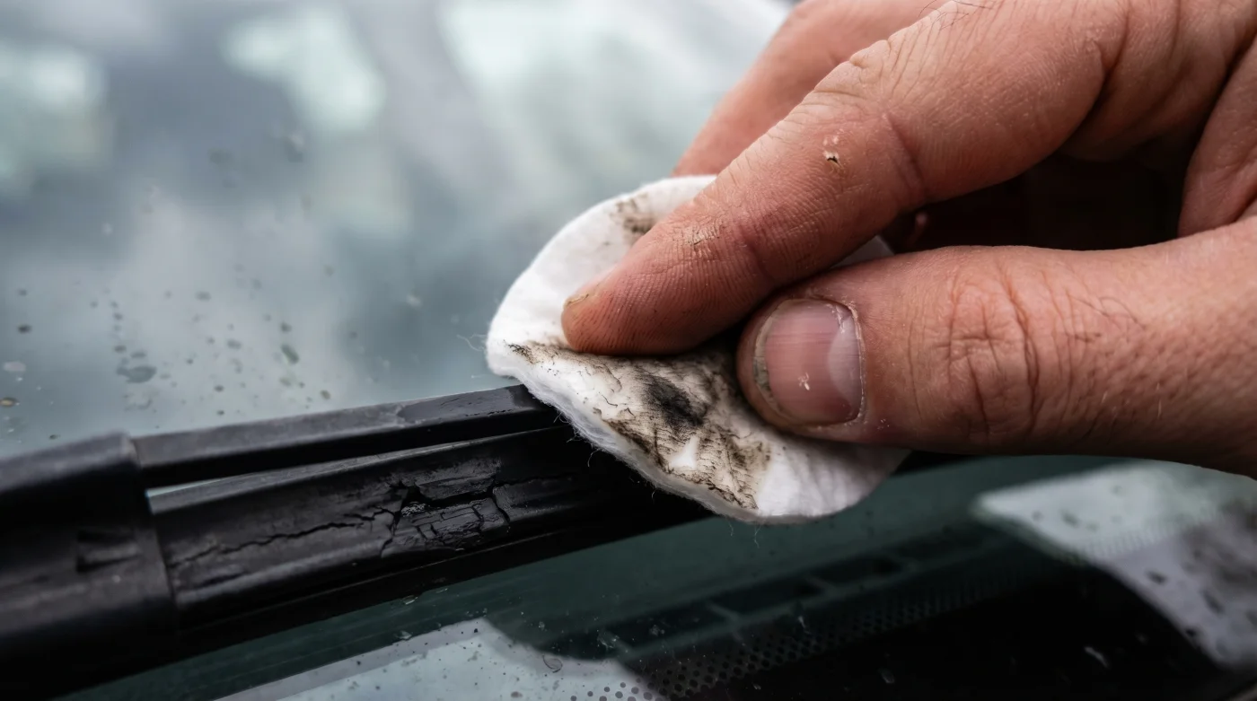 La línea gruesa y negra que quedó marcada en el paño no era el tinte del limpiaparabrisas deshaciéndose, como el cliente temió al principio. Era años de alquitrán, residuos de combustión diésel y cera de autolavado barato que habían formado una segunda piel sobre la pieza original.