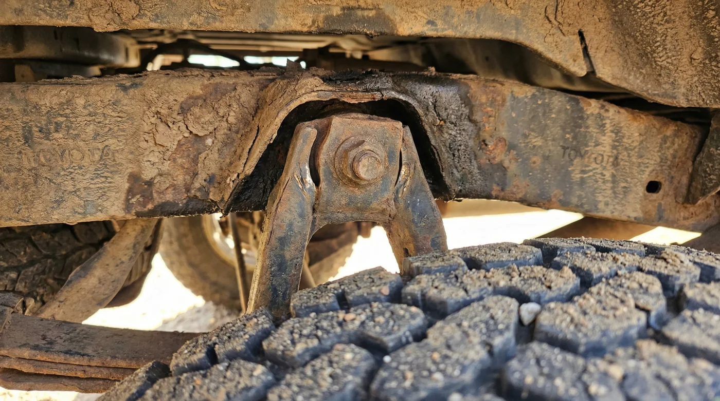 Acomódate en el suelo detrás de las pesadas llantas traseras y dirige tu mirada hacia el punto clave donde las hojas curveadas de metal de la suspensión se unen al cuadro del chasis. Saca tu luz, respira profundo e ignora el óxido superficial que es totalmente normal por la lluvia y los charcos; concéntrate exclusivamente en la forma del eslabón metálico vertical que cuelga firmemente del chasis.