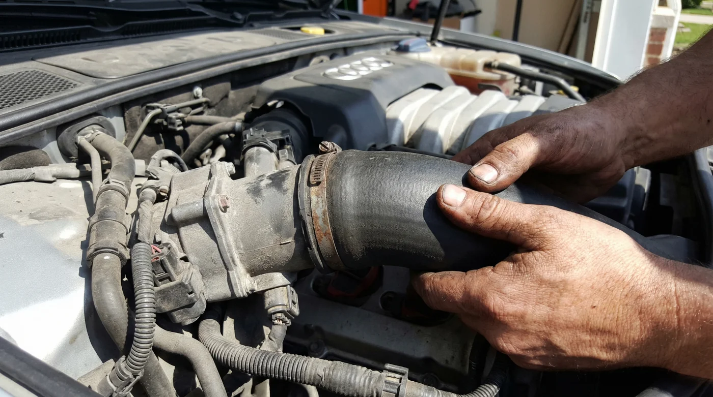 Cuando pisas el acelerador, el turbocompresor necesita succionar aire desde el exterior, comprimirlo violentamente y forzarlo hacia los cilindros. En el Audi A3 básico, el manguito de admisión (la tubería de goma gruesa que conecta la toma de aire con la entrada del turbo) suele instalarse con una ligera torsión durante el ensamblaje en planta. Imagina intentar correr un maratón mientras respiras a través de un popote doblado o una almohada oprimida. Mientras más fuerte jalas el aire, más colapsa el tubo sobre sí mismo, creando un cuello de botella físico justo en el momento en que más oxígeno necesitas.
