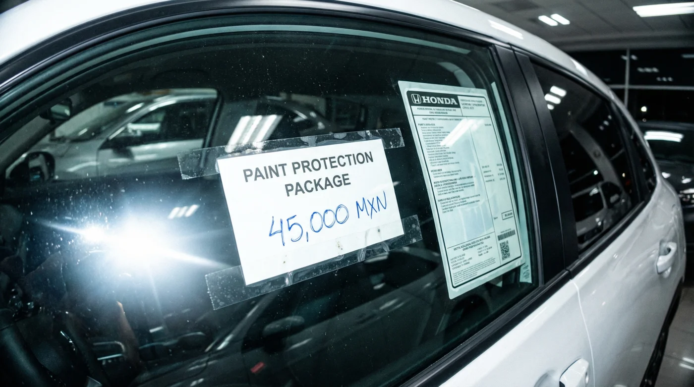 Para el comprador confiado: Llegas con el crédito preaprobado por la institución financiera del concesionario. Como confías en el nombre del banco, no cuestionas los cargos de la hoja impresa. A ti te presentarán el cargo como una Garantía Extendida Estética, sugiriendo que la pintura de la nueva HR-V es sumamente delicada ante el sol mexicano y que rechazarlo arruinará el valor de reventa en pocos meses.